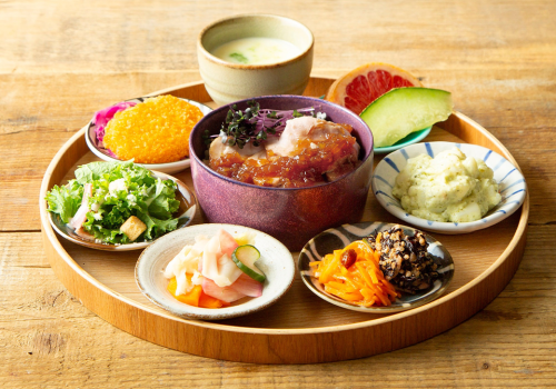 지속가능한 해산물 또는 도쿄산 돼지고기를 메인으로, 색감이 고운 에도 채소를 듬뿍 곁들인, 본 매장의 가장 추천하는 플레이트입니다. 보기에도 아름답고, 영양 밸런스도 뛰어납니다。